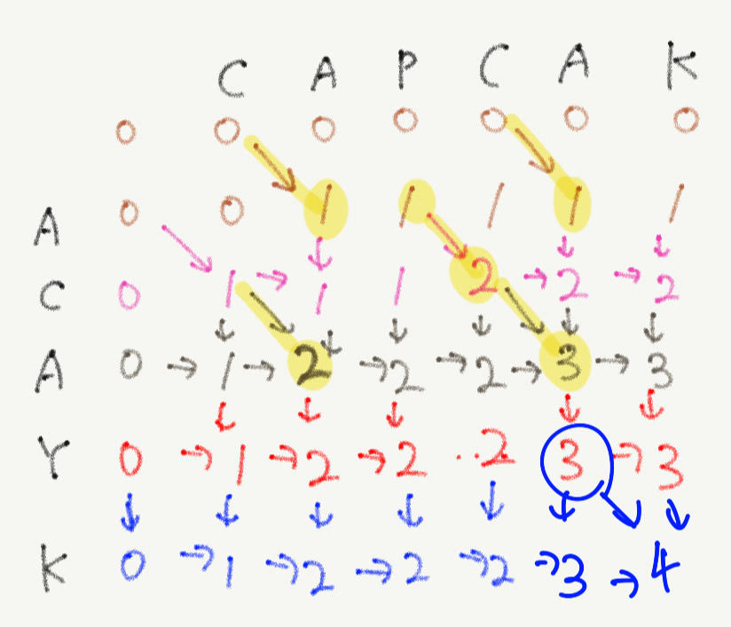 1. a[i] == b[j] 인 경우, dp[i][j] = dp[i-1][j-1]+1